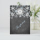 Det här festliga och trendiga svart-vita kritskriftskortet för svar på bröllop har lager av ljusblå och vita snöflingor som matchar vinterbröllopsinbjudan som visas nedan. Det skulle vara perfekt för ett vinterbröllop, julbröllop eller brudvisning, en vinterjubileumsfest eller en vinterbal eller annan evenemang. Här visas det på vanligt papper. Det är enkelt att anpassa med din egen information. Det finns anpassningsbar text som du kan redigera som du önskar. OBS! Tänk på att allt kommer att skrivas ut som det visas på din skärm. Zazzle kommer inte att redigera något för stavfel eller felaktig justering etc., och jag kommer inte att se det när du har beställt det. Om du behöver hjälp med din formulering, vänligen maila mig INNAN du beställer. Om det finns andra förem