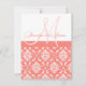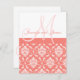 Elegant Monogram, Namn Coral Damask-OSA kort som matchar 5 x 7 tums bröllopsinbjudan i vår butik. OSA kort Monogram och Namn Layout och Design av Elke Clarke © 2008, 2009, 2010. Damask Pattern Licensed.com och WhiteWhimsicalWeddings.blogspot.com. Anpassa med ditt monogram namn och bröllop färg. Lägg till all din bröllop OSA på baksidan av kortet med hjälp av Zazzles meddelanden som är enkla att använda.