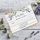 Rustiskt vitt trä som bakgrund, svart text. Dekoreras med lavender- blommigtar och eukalyptus greenery. Anpassa och lägg till ett svar efter datum.