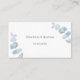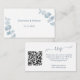 Anpassa och lägg till namn, bröllop webbplats-URL:en för din egen QR-kod och text. En vit bakgrund, blå text. Dekorerad med dammiga blå eucalyptus sprig, stammar.