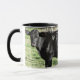 En mjuknad färg fotograferar av två svart Angus för barn kvigor på ett lantligt landlantgårdfält. En har ett stänk av vit på henne buken, och båda är fläckiga i solljus.