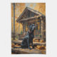 En vacker svart labrador Retriever sitter framför en mysigt loghytt i skogen under hösten