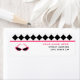 En returadressetikett med svart argyle gräns överst med rosa trim. Illustration av ett par solglasögon för rosa av retro-katter vid öga till lämnat. Anpassa med ditt namn och adress vid högerna.