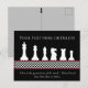 Visa kärlek i det gamla schackspelet med den här eleganten, anpassadets vykort. Den här designen har en uppsättning vita schackpjäser delarare, inklusive Kung, drottning, biskop, Knight, Rook och Pawn på en svart bakgrund. Det finns ett svart och vitt schackbräde mönster med anpassningsbar färg gräns (standardröd färg) på grund. Färg på kortets baksida är ljust grått som standard och har en liten svart drottning biet överst. Slå bara knappen Anpassa för att ändra bakgrunden färg i schackbrädet, grund gräns färg eller färg på baksidan om du vill. Det finns prickar överst och grund för att anpassa kortet med ditt eget citattecken eller text i vit utskrift. Standardcitatet är "Chess är själens gymnastiksalar". av Blaise Pascal. Slå bara knappen Anpassa om du vill redigera eller ta bort texten, eller knappen Anpassa om du vill ändra teckensnitt, storlek text eller färg. Gör ett underbart presentobjekt eller en anteckning för älskare av strategispel, schack, Checkers, spelturneringar, geometrisk design, kartongspel och schack delar. Denna design är tillgänglig för andra artiklar och kan överföras till valfri post på Zazzle-marknaden.