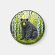 Svart björn som sitter i en frodig grön skog omgiven av björkar, inramad av dekorativt lövverk.