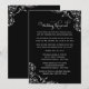 Skapa ett dramatiskt första intryck med denna svarta bröllopsinbjudan för repetitionsmiddagen. Krävande vit scrollande blommor och raffinerad kalligrafi sticker ut mot den mörka bakgrunden och inramar en charmig rimmad dikt som beskriver ceremonin och den festliga middagen. Den slående kontrasten ger denna design en sofistikerad, formell elegans. Anpassa all text, färger och typsnitt för att passa din stil.
