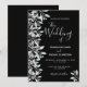 Ett trendigets bröllopsinbjudan i svartvitt. En svart bakgrund på chicen framtill. Dekorerad med botaniska silver och vita färgader och löv. Modern stor, hanterad text, typografi med texten: bröllop i. Mallar för namn och bröllop. Vit text. Bakåt: svart bakgrund.