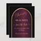 Ett Save the Date-kort för en 70-årsfest. En svart och burgunderfärgad bakgrund, dekorerad med en falsk guldvalv. Anpassa och lägg till ett datum och ditt namn. Texten: Sjuttio och Spara datum är skriven med en stor trendig handskriven stilskrift.