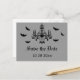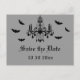 En eerie chandelier och en grupp fladdermus accentuerar detta Halloween-Spara vykortet för datum.