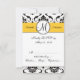 Vintage svart och vit damask-svitkort för bröllopsinbjudan med gul accentfärg som du kan anpassa. En vacker damask-mönstrad bakgrund framhävs med en rund prydnad och monogram ovanpå en gul linje som innehåller brudens och brudgummens namn. Photoshop-effekter med skuggor ger detta kort ett 3D-utseende som trycks direkt på ditt valda papper. Utformad av Elke Clarke ©2010, 2012. Grafik licensierad. Ett elegant sätt att sätta tonen för ditt bröllop. Anpassa med dina bröllopsdetaljer och information om bröllopssvar för den perfekta bröllopsinbjudan.