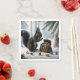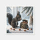 En ekorre har en akorn i en snöskog omgiven av en samling akorner i en liten läderväska
