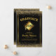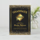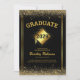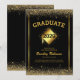 Modern examensannonseringskort med svart bakgrund och guldglitter, en studentmössa med examensår, studentens namn och deras framtidsplaner.