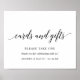 Denna svart-vita förmånsskylt är perfekt för alla typer av bröllop, från elegant till enkelt, rustikt till boho. Denna skylt uppmanar gästerna att ta ett kort eller en present med svart kalligrafi-skrift och tre rader med anpassad text.