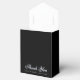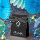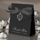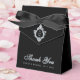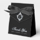 En svart och silverfärgad vigselfavoritbox. På klaffen har den en falsk silverfolie med ett monogram i, från 2 initialer.