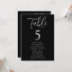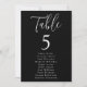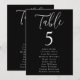 Modern sittplatsplan för bröllop med "Bord" visas i ett vitt skript med bordsnummer och gäst namn som visas nedan i svart bakgrund. Utformningen upprepas på baksidan. Om du vill beställa bordsnumrets sittande diagram redigerar du varje kort med bordsnumret och gäst namn och lägger till det i kundvagnen. Designad att samordna med vår samling Simple Script bröllop.