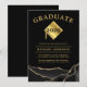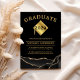 Trendig examensannonseringskort för 2025 med svart bakgrund och ett gyllene glittermönster, en studentmössa med examensår på toppen, studentens namn och deras framtida planer.
