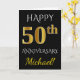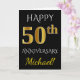 Denna enkla, personliga bröllopsdagskortdesign har meddelandet "GRATTIS PÅ 50-ÅRSDAGEN", där "50:e" har ett falskt guldliknande utseende. Framsidan har också ett anpassat namn och en svart bakgrund. Insidan har ett personligt bröllopsdagmeddelande. Det kan ges till en make eller maka för att fira parets femtioårsdag. [~Z0000076]