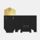 En elegant svart och guld bröllopspresentlåda. Flappen är i falskt guld och den har en svart vapensköld med brudparets initialer, de två initialerna för bruden och brudgummen. Resten är svart med guldfärgad text på framsidan, i den nedre delen: meddelandet "Tack" i en elegant kalligrafi, namnen i versaler och datumet i mindre versaler.