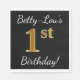 Den här enkla pappra napkin-designen innehåller ett meddelande som "Betty-Lous första födelsedag!", där "1:a" har ett faux-guld-liknande utseende på en svart färgad. Namn kan vara personlig. Den skulle kunna användas i en födelsedagsfest till någon som firar sin första födelsedagsfest. [~Z0000079]