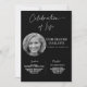 Denna inbjudan har en enkel och modern minimalistisk stil med vacker script kalligrafi och typsnitt utan seriffer och med seriffer på en svart bakgrund. Du kan anpassa med ett foto av din älskade och information om begravningen/minnesstund. Du kan anpassa inbjudan på valfritt sätt för att minnas och hedra minnet av din älskade. Observera bara att formuleringen "Livets firande", "tjänst" och "mottagning" inte kan redigeras. Du kan ändra färgen eller ta bort den från dödsannonsen om begravningsminnesstjänsten om du vill. Klicka bara på anpassa inbjudan.