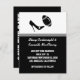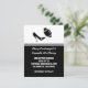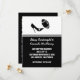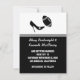 Lekfull fotboll bröllop Save the Date-kort gjort i svart, grått och vitt. Grafik med en elegant svart stiletthög hacka som sparkar en svart och grå fotboll, pryder den övre vita delen av kortet. Den nedre delen av kortet är gjort i svart, med en grå rand nära toppen, och anpassad vit text som är redo att anpassas med din bröllopsinformation. En svart baksida har vit text som löper ner på vänster sida med texten Save The Date. Underbara Save The Date-kort för det fotbollsfansaktiga paret.