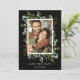 Denna bröllopsinbjudan för att spara datum har en målad akvarell av eukalyptus, gröna blad, röda bär, tallgrenar och en falsk guld rektangel ram med anpassad text på baksidan. För mer avancerad anpassning av denna design, klicka på "Anpassa ytterligare". Matchande artiklar finns också tillgängliga.