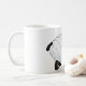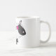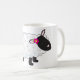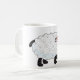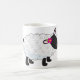 Ett svart belagt får med massor av vit ull och en blomma i håret. Den här designen ser ut att gälla i Mugg