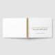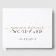 En enkel modern minimalistisk typografisk gästbok med brudens och brudgummens förnamn i guldsnitt och gemensamma efternamn i svart serifstil.