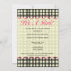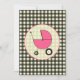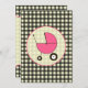 En inbjudan som presenterar en svart ginghambakgrund över varm beige med shock rosa, klipper. Personifiera den bruna stilsortstexten med specificerar av din händelse. Motsatssidan är fast gingham med en shock rosabarnvagninsida som matcha cirklar den formade ramen.