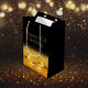 Elegant, klassisk, glamorös och feminin stil party-presentväska för en 60-årig kvinna. Ett guld-färgad-band och båge med faux golden glitter och gnistra, lite av lek och lyx för en födelsedag. Svart bakgrund. Golden Text: Lycklig 60:e födelsedagen!