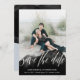 Vackra och unika spara datumkortet med ett svart överlägg som sparar datumet så att fotot når fram i ett söt snabbt skript. Lägg till ytterligare ett foto på baksidan tillsammans med information om bröllop.