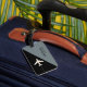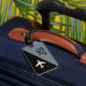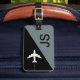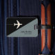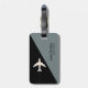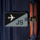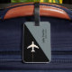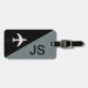 Halvljus grått/ halvsvart bakgrund med grafiskt flygplan och initialer (monogram), för nästa flygplans resa