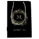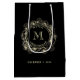 Förhöj bröllopspresenterna med denna stilfulla svarta och gyllene väska för bröllopsgäster. Med en personlig initial, intrikat blomster ram och ert bröllopsdatum, är det ett lyxigt sätt att tacka era närmaste män med elegans och koordination.