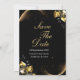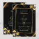 Designen har en dramatisk svart bakgrund förstärkt med lyxiga guldfärgade accenter och modern geometrisk ram, i kombination med eleganta metalliska blommotiv för en sofistikerad look. Denna svarta och guldfärgade blommiga bröllopsinbjudan skapar en tidlös och exklusiv estetik, perfekt för formella bröllop, kvällsevenemang och glamourösa firanden. Anpassa för att skapa fantastiska anpassade inbjudningar för din speciella dag.
