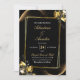 Designen har en dramatisk svart bakgrund som förstärks med lyxiga gyllene accenter och modern geometrisk ram, i kombination med eleganta metalliska blomdetaljer för en sofistikerad look. Denna svarta och gyllene blommande bröllopsinbjudan skapar en tidlös och exklusiv estetik, perfekt för formella bröllop, kvällsevent och glamourösa firanden. Anpassa för att skapa fantastiska anpassade inbjudningar för din speciella dag.