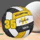 Det här söta volleybolltemat dekorativ kudde har en bild av en realistisk volleyboll som har svarta, guld och vita paneler, på vilken du kan anpassa spelarens namn, monogram eller varierande brev, lag och mascot namn och ett jersey nummer på framsidan och baksidan - volleybollpanelens svarta och guld blandas med en blommigt kaleidoskopisk mönster för en texturerad textur utseende - av katz_d_zynes