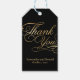 En bröllopspresentetikett med svart bakgrund och orden "Tack" i falskt guld folie och utrymme för namnen och bröllopsdatum för bruden och brudgummen.