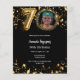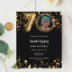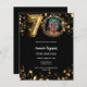 En modern, snyggt fotoinbjudan för en 70:e födelsedagsfest. En klassisk svart bakgrund, dekorerad med faux guld-stjärnor. Anpassa och lägg till information om party. 1 lakan = 1 inbjudan tryckt kant till kant.
