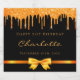 Faux färgad ribbon och båge med faux guld glitter droppar, färgdroppstift. Chicens svarta bakgrund. Anpassa och lägg till ett namn och ett datum. Med texten. Lycklig 21:a födelsedag (eller i någon ålder). Golden färgad brev, ett modernt handskript i stil.