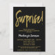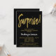 En elegant, modern svart och guld överraskar födelsedagsfest inbjudan. Glam-skripttext överst och guld nedanför med namn i stående vit text