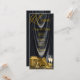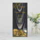 Kvinnas svarta och gyllene födelsedagsmeny och program med vackra gyllene höga klackar skor, presenter, parfym och champagneglas på en vacker svart satin bakgrund. Dessa svarta och gyllene festmenyer eller program kan enkelt anpassas med den text du väljer på framsidan och baksidan i den teckensnittsstil du föredrar. Menyn kan inte tas bort.