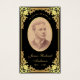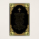 Ett minnesbönkort med en gammal prägel för en begravning. På båda sidor är det svart och har en elegant barock guldram i vintage-stil. På framsidan finns ett ovalt foto i vintage-stil med förgylld ram och förgylld text under. Namnet är skrivet med en elegant kalligrafisk skrift. På baksidan finns en bön, med förgyllda versaler, och ett förgyllt kors ovanför. Vintage-ramdekorationerna, den ovala ramen runt fotot och korset på baksidan är falskt guldblad.