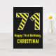 Bekläda av denna djärva och uppmärksamhet-gripande för hälsningkortet för födelsedagen themed design presenterar en stort antal "71" med ett svart- och gultrandmönster, tillsammans med meddelandet "den 71st födelsedagen för lycklig," och ett anpassningsbarnamn. Bakgrunden av bekläda är färgadsvarten. Insidan presenterar ett beställnings- födelsedaghälsningmeddelande eller kunde kanske göras klar, och tom vänstersida, om ett meddelande är att vara skriftligt by, räcker i stället. En något liknande för personligfödelsedagkort denna styrka är en roligt långt som överför födelsedagönskemål till någon som firar deras första födelsedag för sjuttio. [~Z0000382]