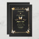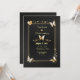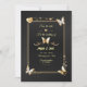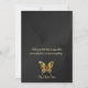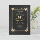 En vacker rädsla datumet, bröllopsinbjudan gjord av guldfjärilar och guldhjärtan på en svart övertoningsbakgrund, med en gyllene glödande ram och en fin blek fjäril svart på baksidan.
