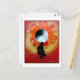 En sittande figur ses i skugga mot en svart hål sol (svart och vit mitt, gula strålar) och en röd himmel. En original spraymålning gjord med maskeringstejp, färg, träutskärning och några minuter.