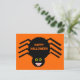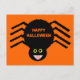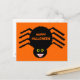 Det här strålande Halloween-vykortet har en kuslig svart spindel med åtta håriga ben, gula ögon med stora svarta pupiller och med öppen mun som visar sina huggtänder. Bakgrundsfärgen är orange och spindeln har orange text på ryggen som säger "happy Halloween".