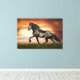 En stor häst gallrar över fält när sol går, vilket kastar en dramatisk glöd i himmel. Scenen fångar hästens skönhet och energi mot en bakgrund av vibrerande färg.