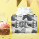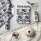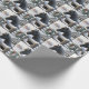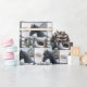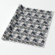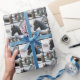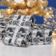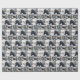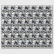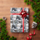 En svart häst står nära ett stängsel som är täckt av snö och som dekoreras med en feberkrans