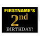 Den här födelsedagskalenderns hälsningskort innehåller ett meddelande som "FIRSTNAME's 2nd BIRTHDAY!", där "2nd" har ett utseende som liknar guld och liknar färg. Mottagarens namn på framsidan kan anpassas, och bakgrunden är svart på färgad. Det innehåller också ett hälsning-meddelande från anpassadets födelsedag på insidan. Ett sådant här födelsedagshälsningskort kan kanske ges till någon i firande på deras andra födelsedag. [~Z0000183]