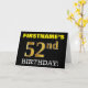 Den här födelsedagskalenderns hälsningskort innehåller ett meddelande som "FIRSTNAME's 52:a BIRTHDAY!", där "52:a" har ett utseende som liknar guld och liknar färg. Mottagarens namn i framkanten kan vara personlig, och den främre bakgrunden är färgad svart. Det innehåller också ett hälsning-meddelande om personligens födelsedag på insidan. Ett sådant här födelsedagshälsningskort kan kanske ges till någon i firande på deras femtioandra födelsedag. [~Z0000183]